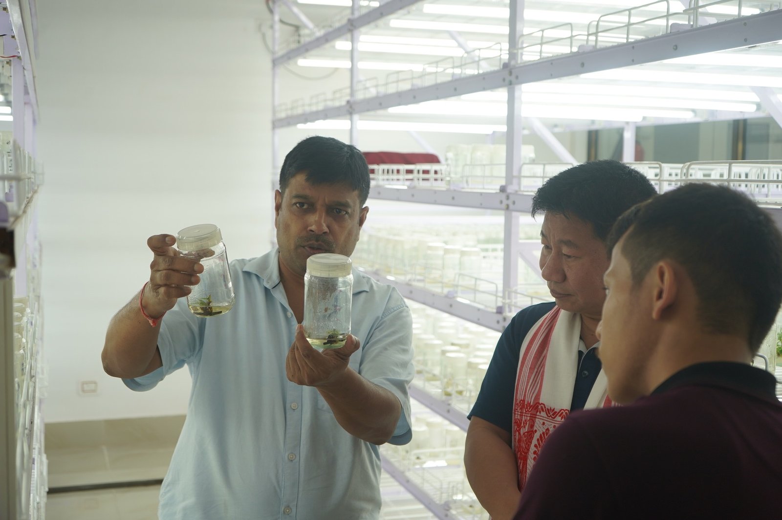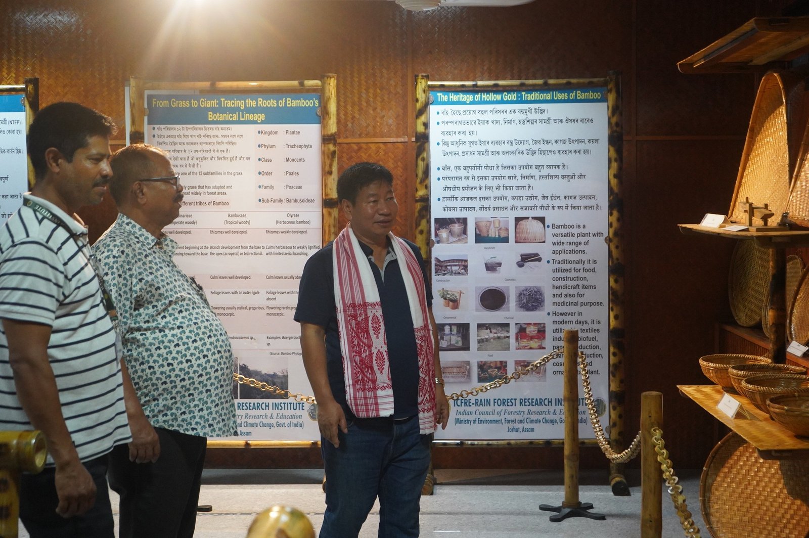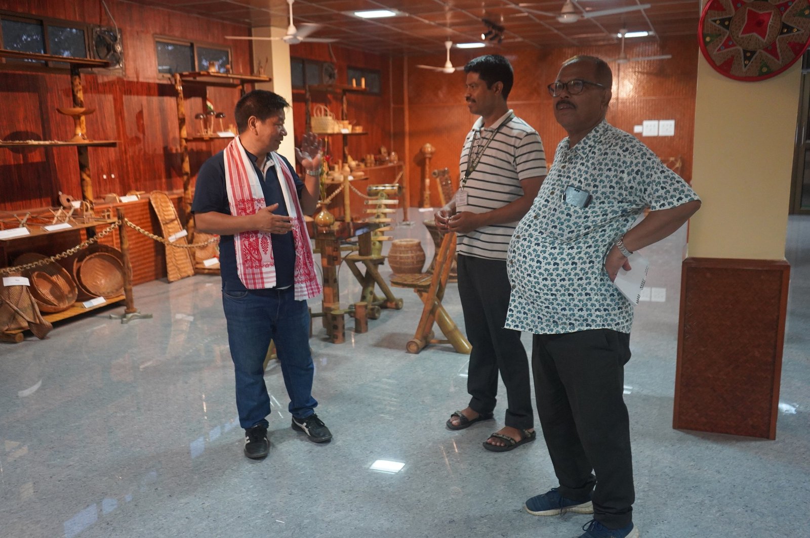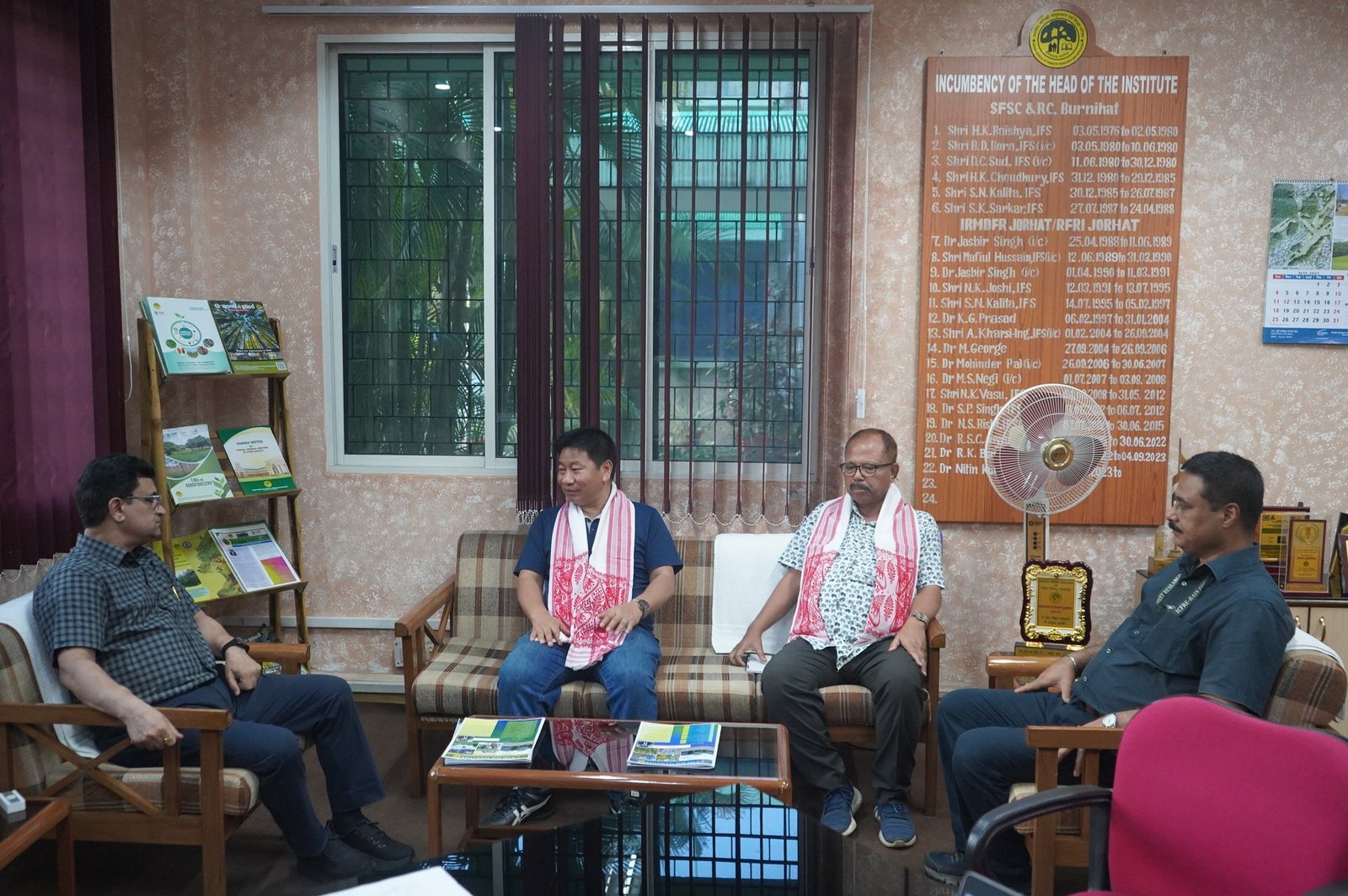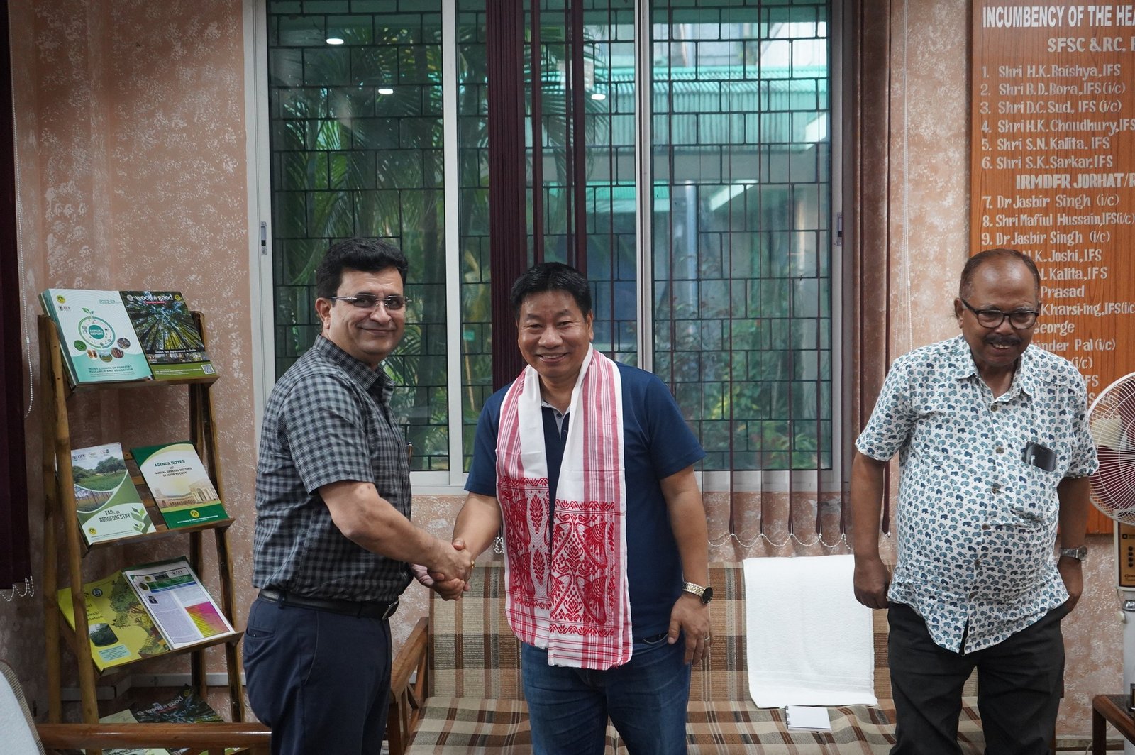 Shri M. C. Omi Ningshen, IRS, Managing Director, North East Cane and Bamboo Development Council, Burnihat (Assam) along with Dr. T. C. Bhuyan, Consultant visited ICFRE-Rain Forest Research Institute, Jorhat (Assam) on 10 June, 2025. Dr. Nitin Kulkarni, Director welcomed the dignitaries with traditional Phulam Gamosa. Discussion on wide range of issues, particularly on bamboo was held during their visit to the Institute. Later, they visited Tissue Culture Laboratory, Bamboo Nursery and Bamboo Museum cum Interpretation Centre of the Institute. Sri R. K. Kalita, Head, Extension Division and Dr. Satyam Bordoloi, Head, Genetics and Tree Improvement Division guided the dignitaries during their visit to the labs and facilities.